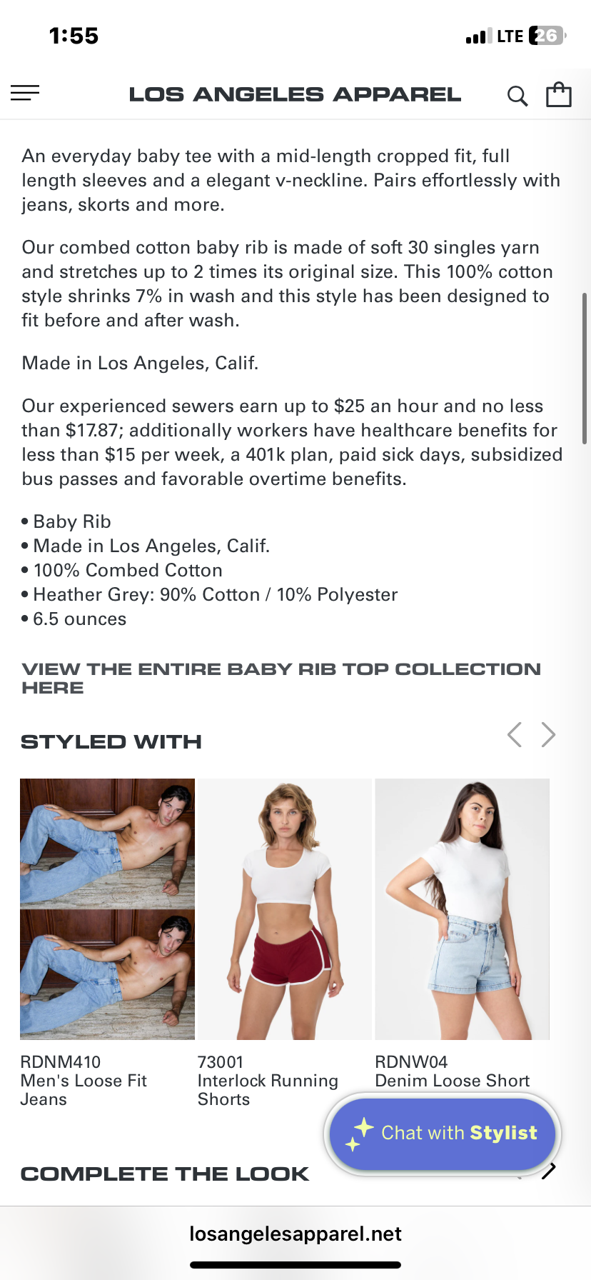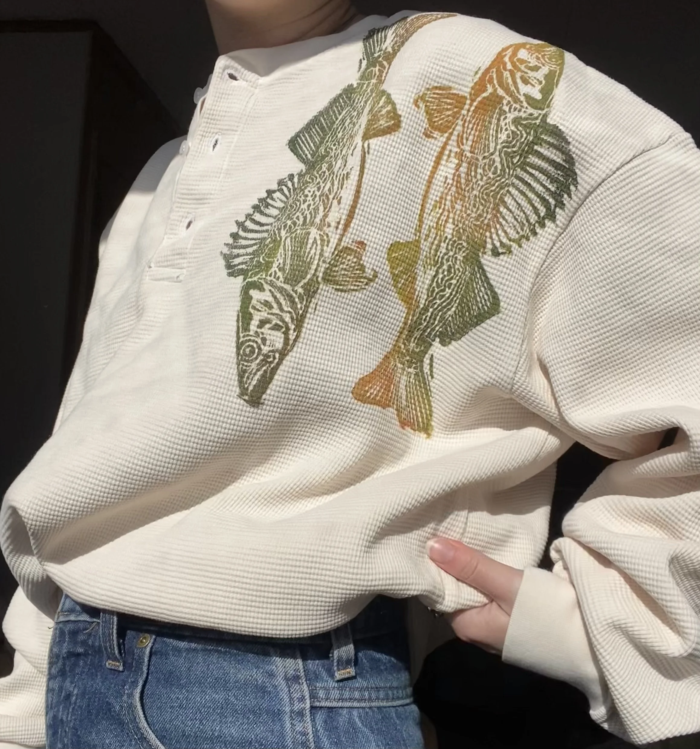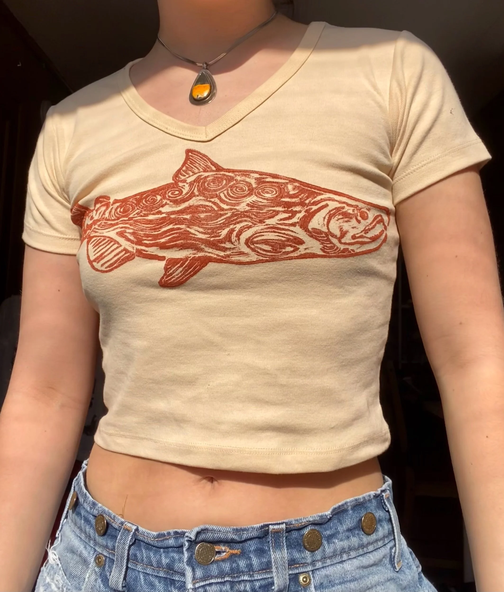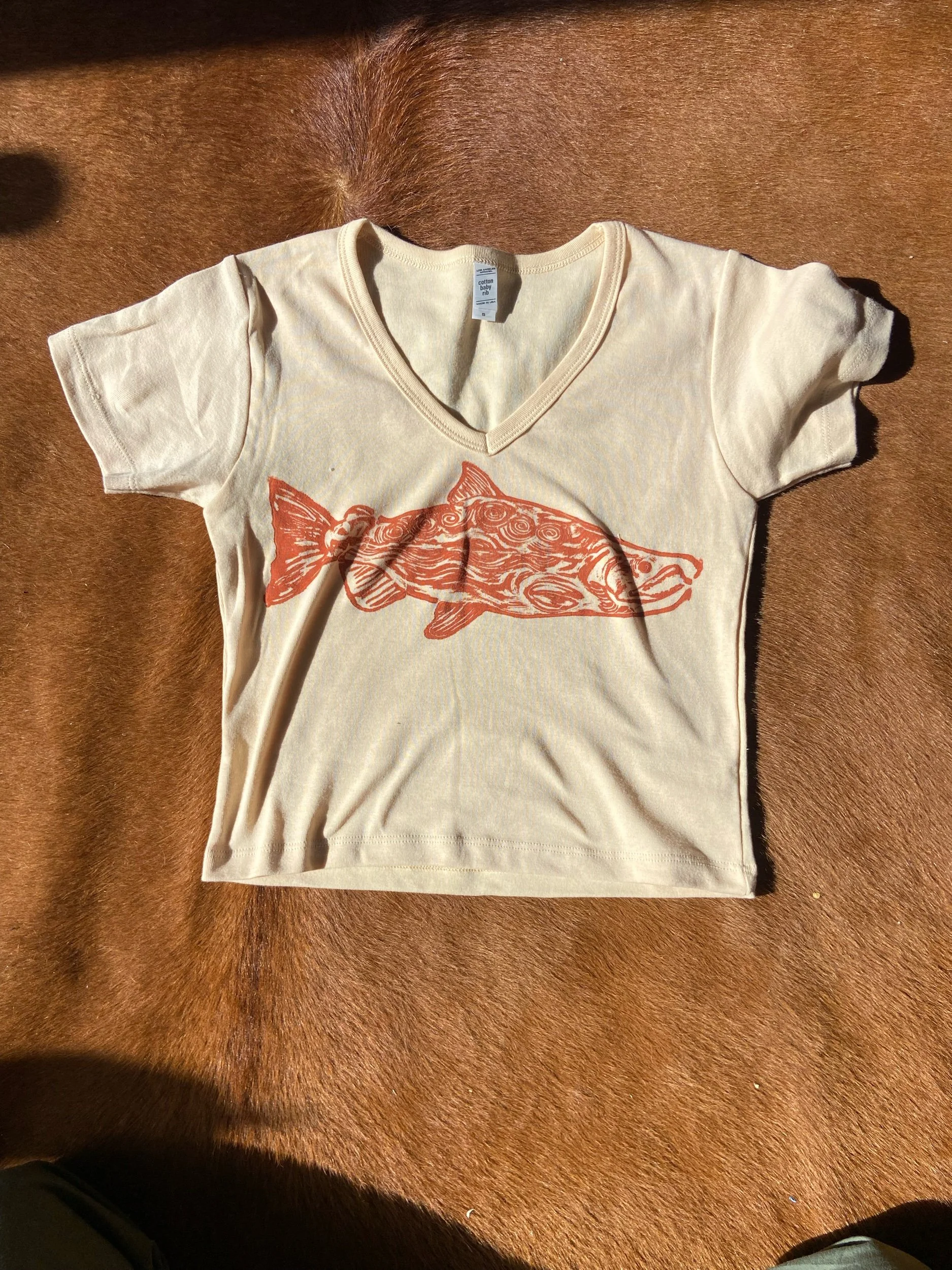 printed on a Los Angeles apparel 100% cotton baby rib v neck cropped tee in cream