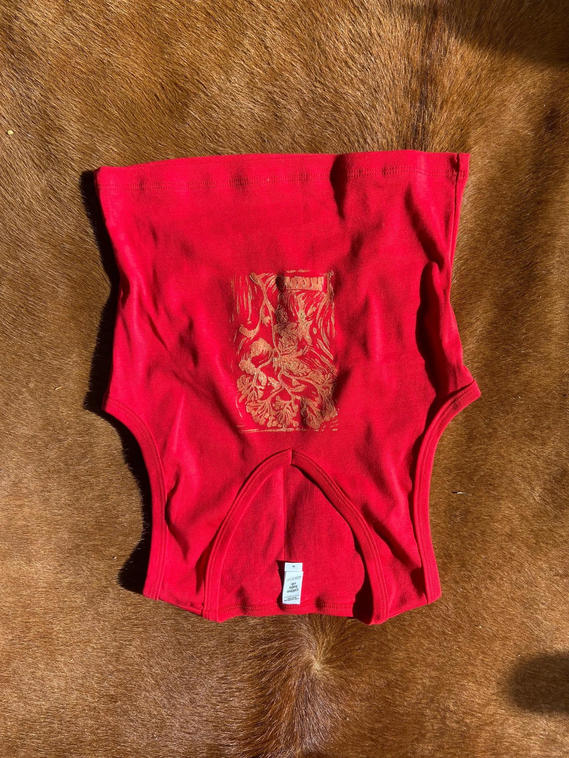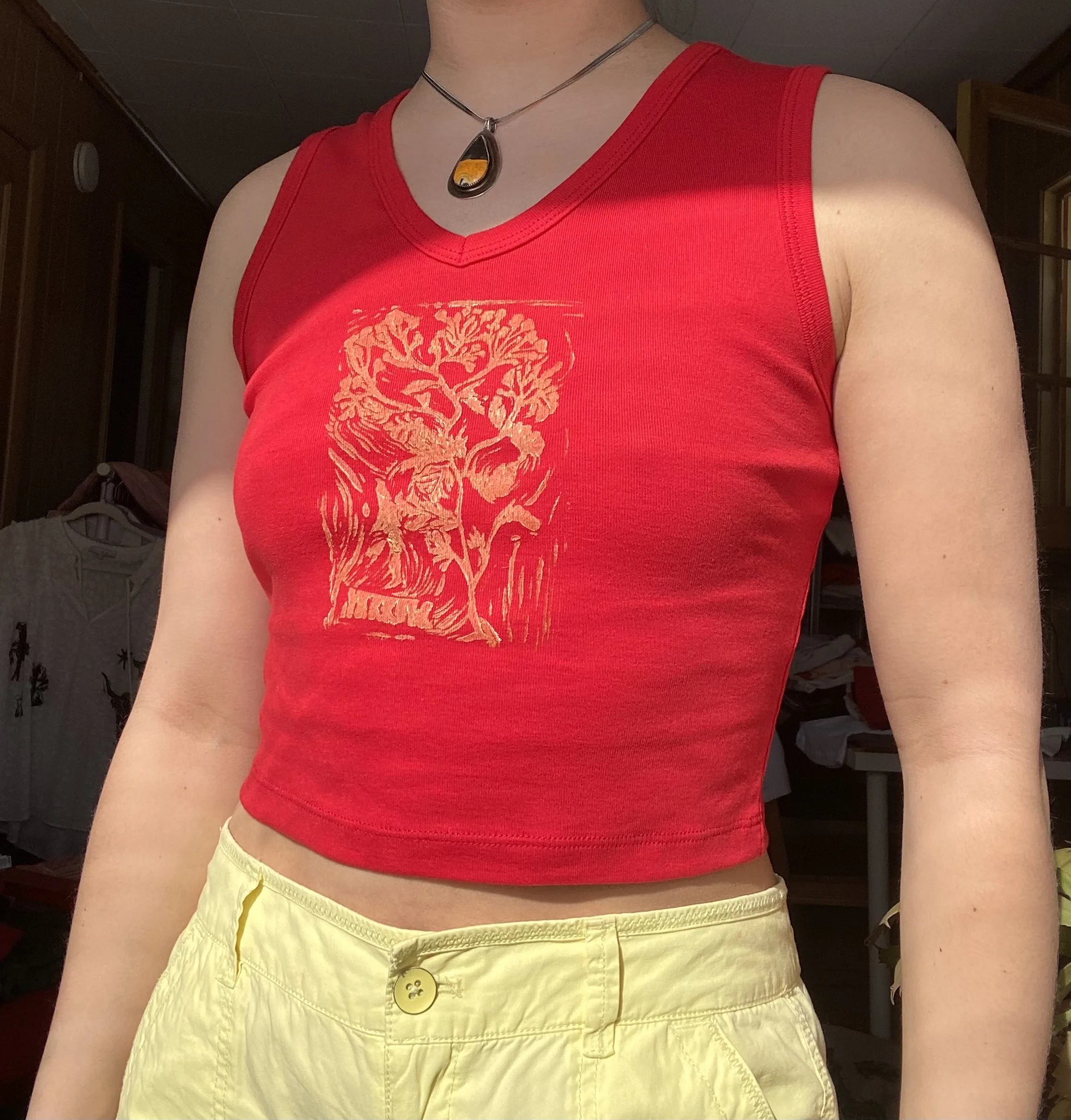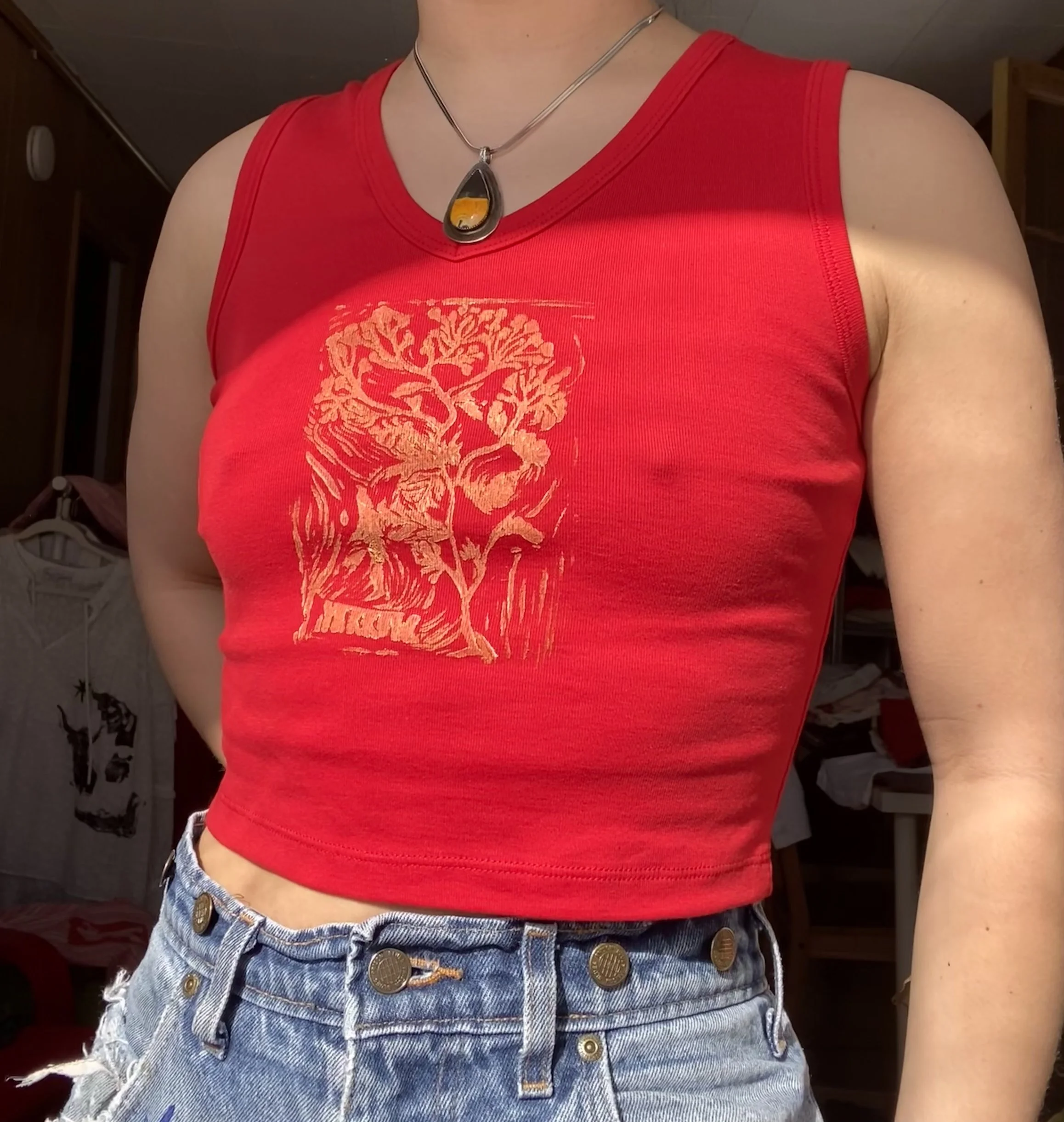 printed on a Los Angeles apparel 100% cotton v neck cropped tank in red