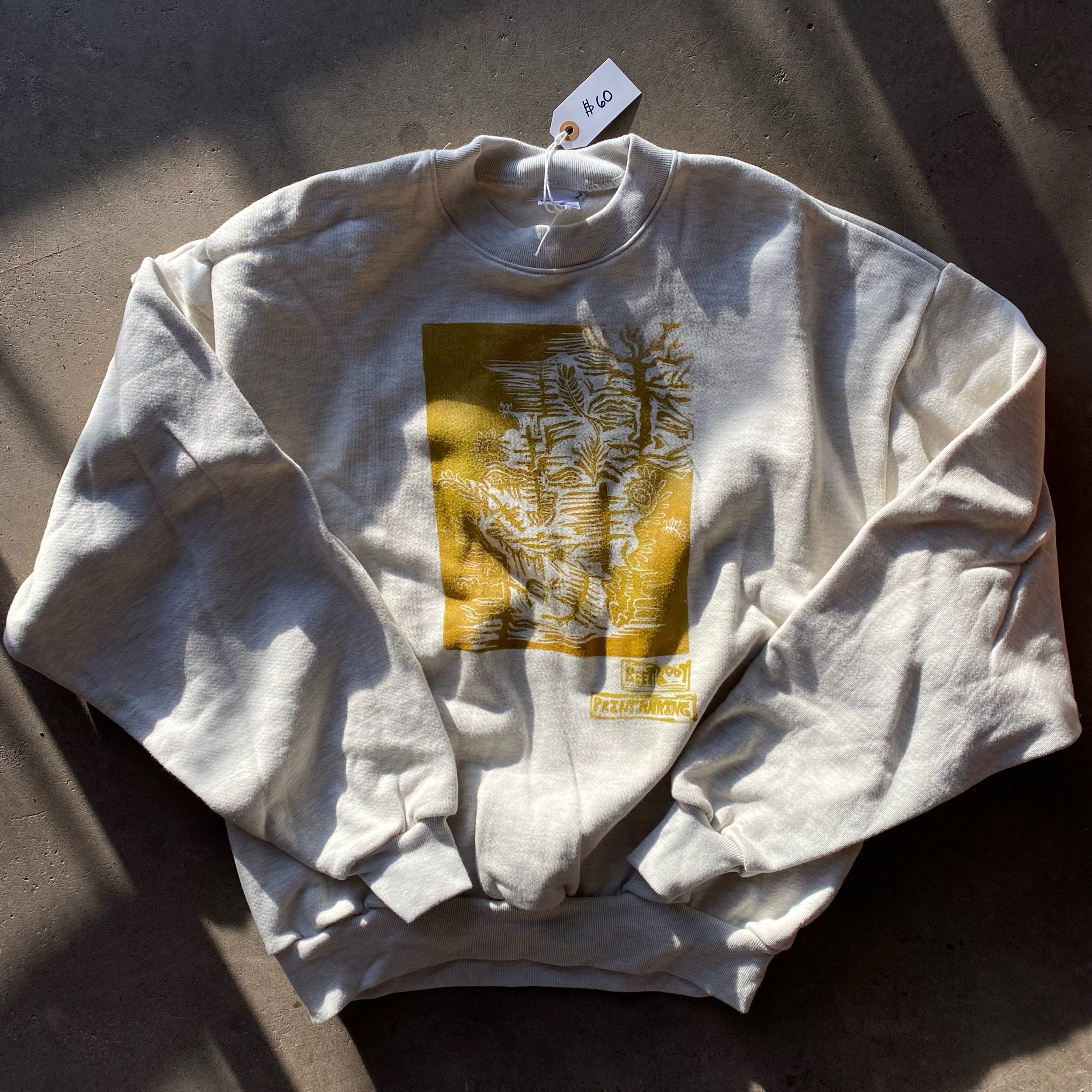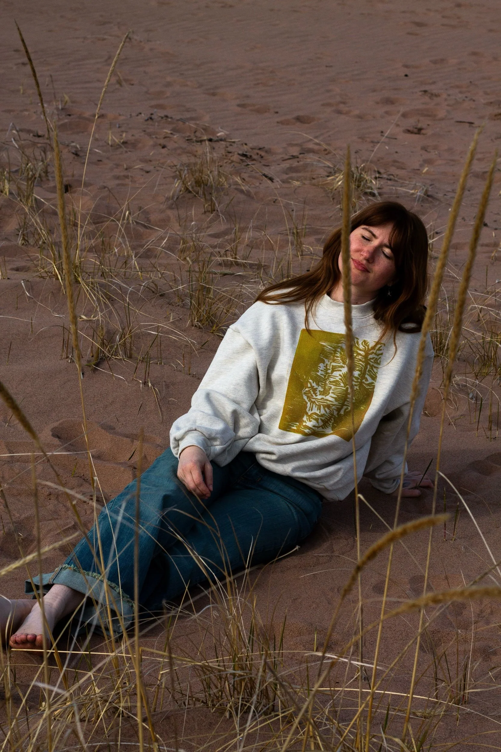 Los Angeles Apparel crewneck 12oz 100% cotton plush fleece sweatshirt in scour (warm brown/heather grey) with original hand carved bug trails block print in speedball ink